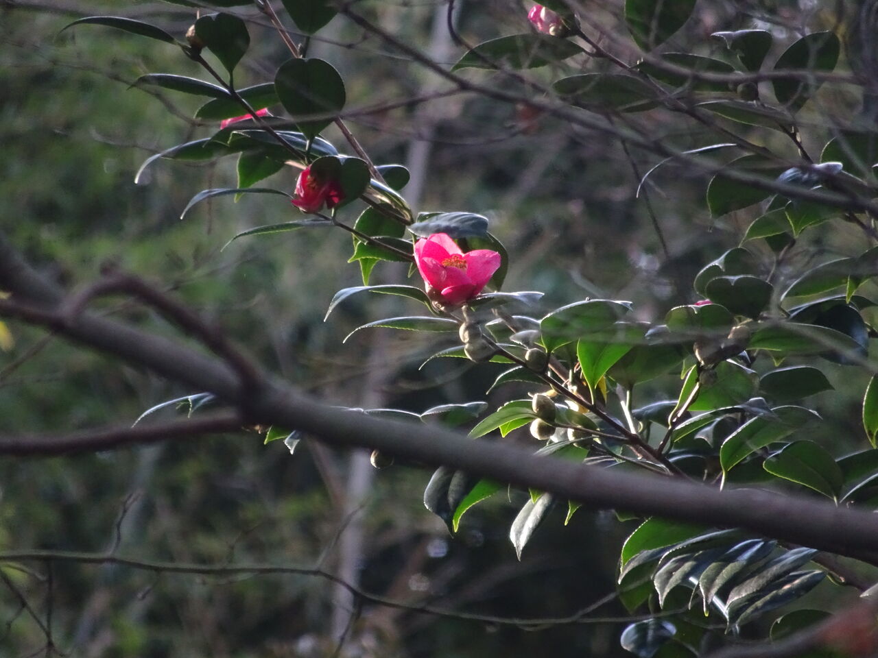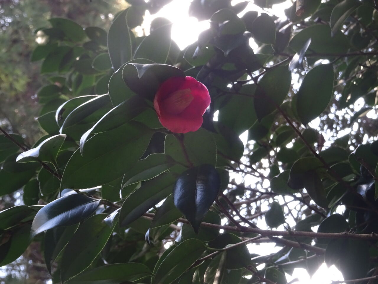 2023年01月24日 山椿 山椿は既に咲いた!! 白や紅と違い、見にくい所に咲いておる!! 山椿は、色が赤ではあるが、 少し黒味が有り、目立たない!! 黒椿とも違い、少し赤い。 花が落ちて、苔の上や石畳の上に落ちると風情がある。 茶人は、茶室までの道に、 掃除した後に敢えて椿の花を置くことが有る!! これを、「 通 」とも言うそうじゃ!! 和尚もその通を使えばよいが、 「すぐに落ちよるから、せんでも“ 通 ”よ」言っておる!! 自然が、和尚の“ 通 ”を造っておる!!!!!