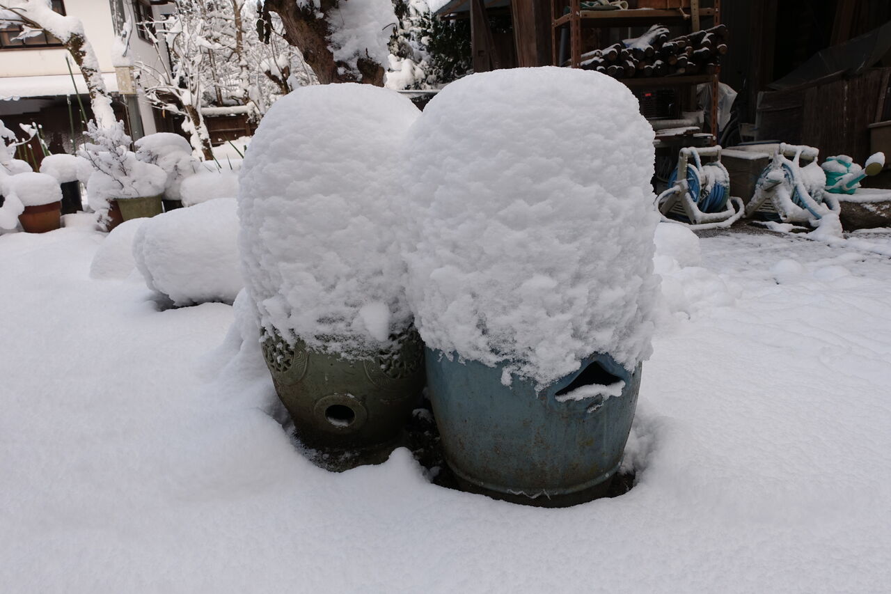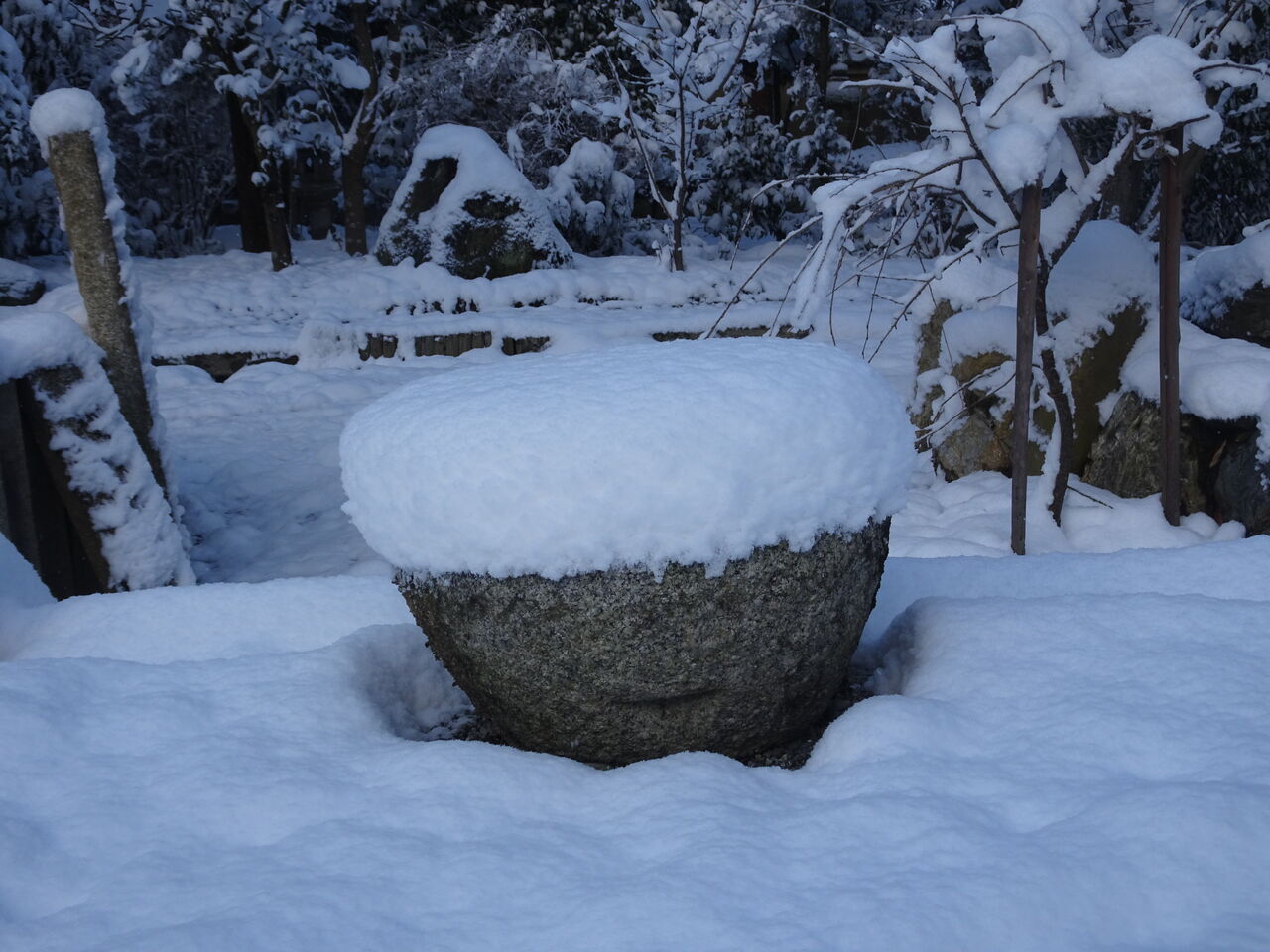 2023年01月28日 ファッションショー うひゃから~ 帽子を被っとる!! 庭杭・灯篭・切り株・手水鉢・・・ 帽子のファッションショーじゃ!!!!! 自然も面白い形を教えてくれる!! ただでショーが楽しめる!! じゃが寒いのう!!!!