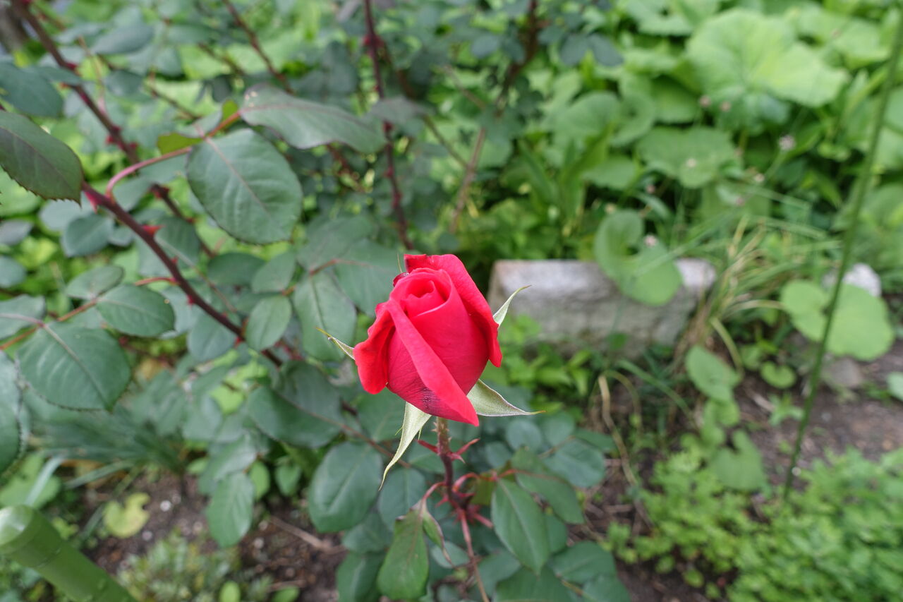 2023年06月17日 バラ 蕾じゃったばらが裏庭に咲いたわ・・ それも中々鮮やかで・・ それも大輪じゃ・・ 庭で咲かさんのか?と和尚に聞くと? 日本庭園では似合わん、と・・ 椿の大輪は良いそうじゃが・・ バラは矢張り洋庭園じゃそうじゃ!!