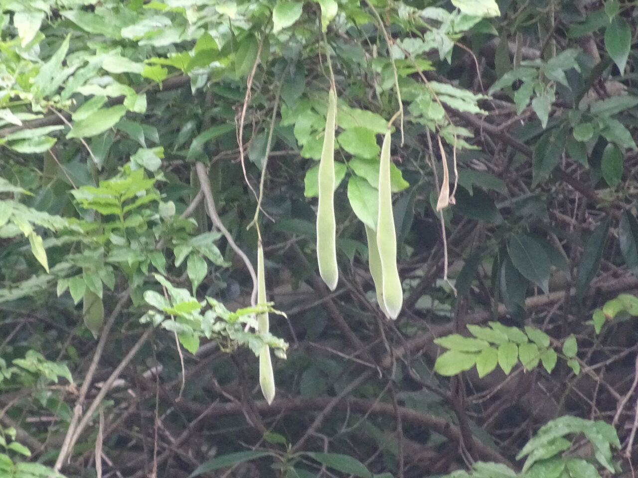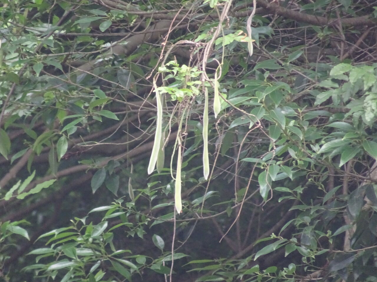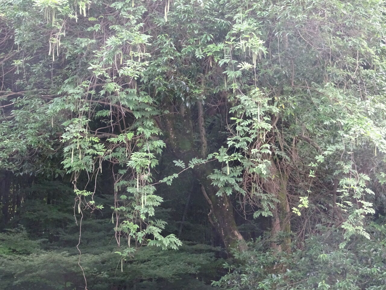 2023年07月26日 藤の実 4月に咲いていた山藤・・ お墓の南の谷の木の上に咲いた・・ 樹木葬の葬苑からよく見えた。 その花が終わり、実が付いた・・・ 枝豆の長いのん、と言えば適切か!! 採って食べたいが、狸の儂は登れんし、湯がけんから諦めた!! 和尚に聞くと、食べられんそうじゃ・・ 硬すぎて、固すぎて・・・ しかし長い鞘の実じゃ・・ 面白いのう・・・ 皆は、藤の実の事を知らんじゃろう・・ 花に特化して手の入った藤の花を見ていては分からんわな!!!!! じゃが一辺食べたいのう・・ ビールを片手に!!!!!