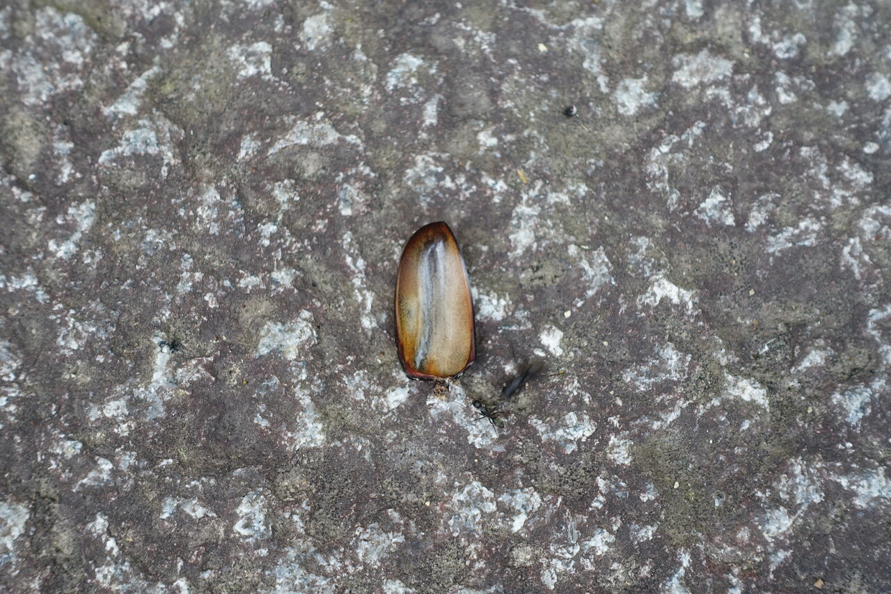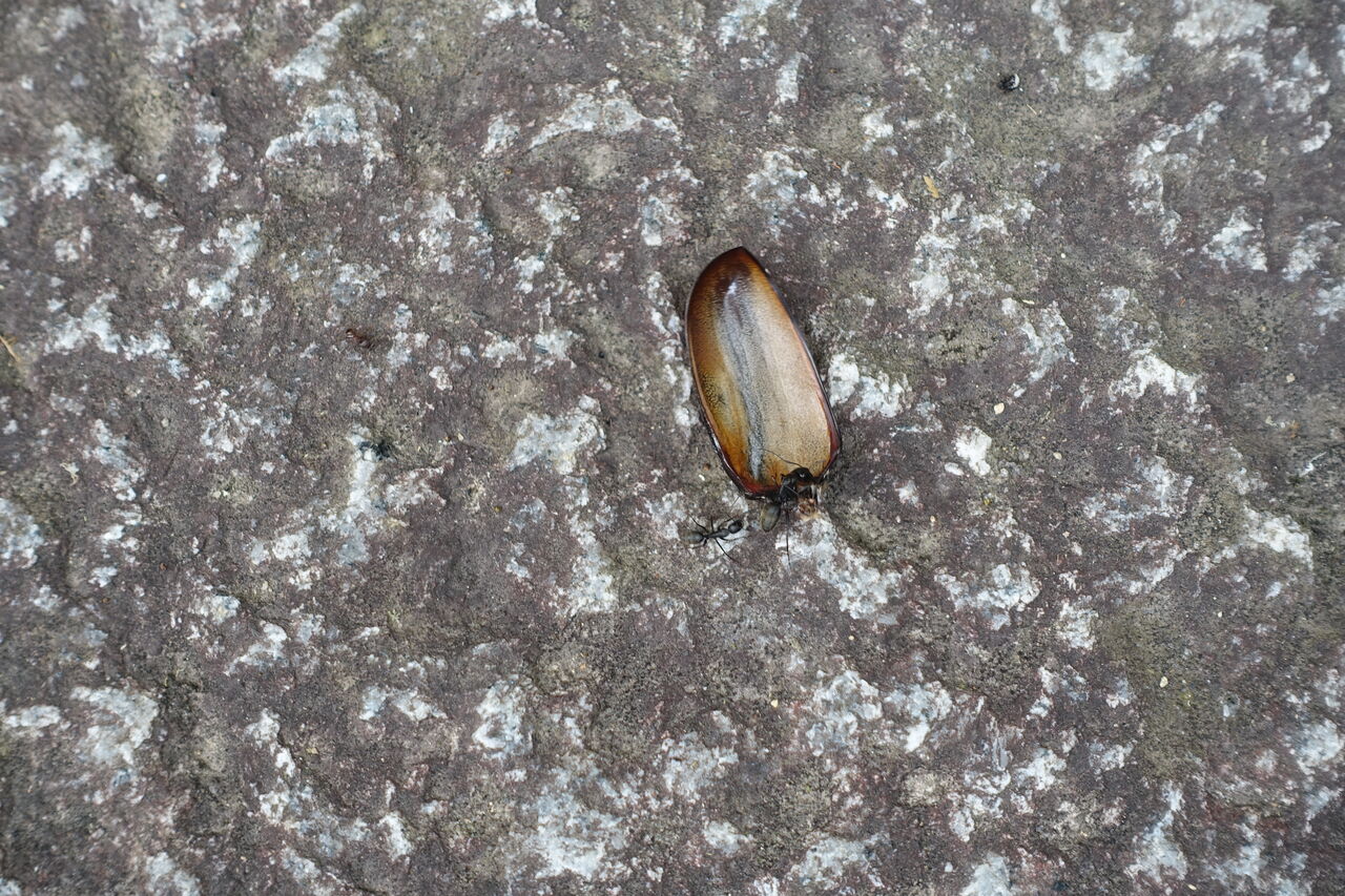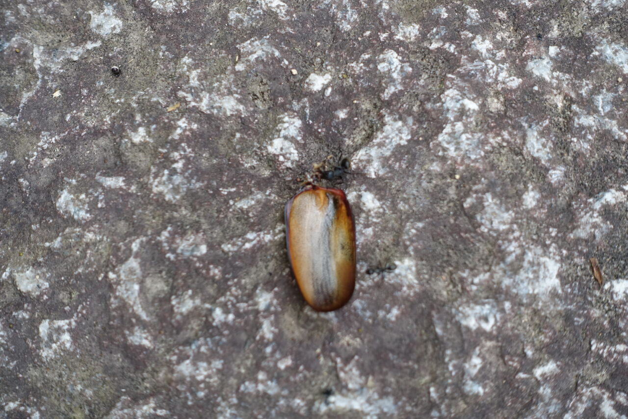 2023年07月28日 カブトムシ 無残 おう、何と!! カブトムシの背中ではないか!! 革だけになっておる・・ そう言や・・ この上の木に蜜が出とったか・・ と言うことは、蜜を吸っとる間に襲われ・・ 無残!! 食われたか!! しかし、その革だけになったカブトムシを・・ 更に食べようと・・・ 蟻が運んでおる・・・ 自然とは面白い・・・ 躯が最後まで生きるすべになっておる・・・・ 人間は自然を忘れておる・・・・・