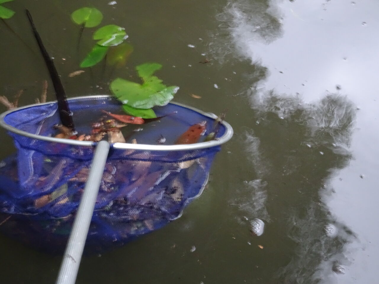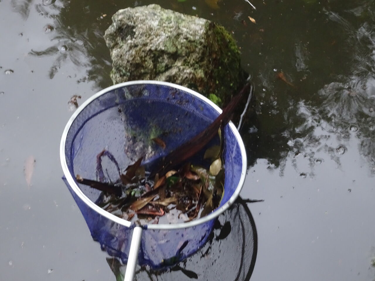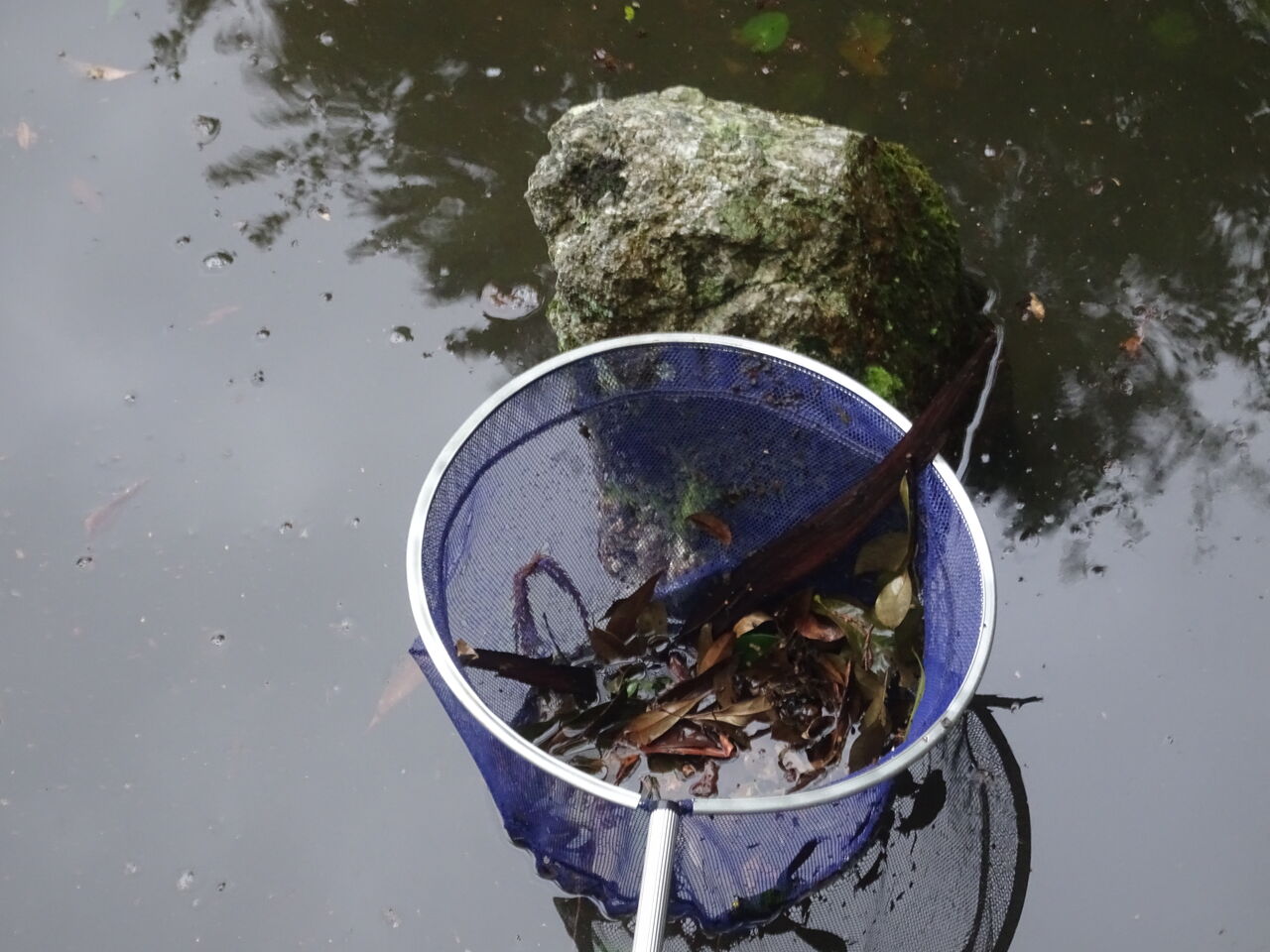2023年09月06日 大雨の後 大雨が降った・・ 雨が止んだと思ったら、和尚が直ぐに出て来た。 何やら虫取り網を持っとる? 何をするんかと思ったら、池で水遊びをしとる?? と思ったら、雨で池に入った葉っぱを抄うておる!! 色んな仕事が有るもんじゃ!! 池が水で一杯じゃて・・ 池の周りから網を突き出し、葉っぱを抄うておる!! 御苦労さん!! わしゃ、身体を乾かそう!!!!!