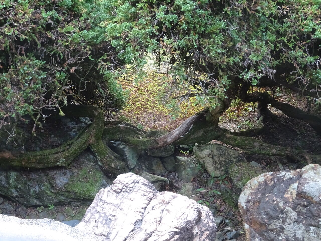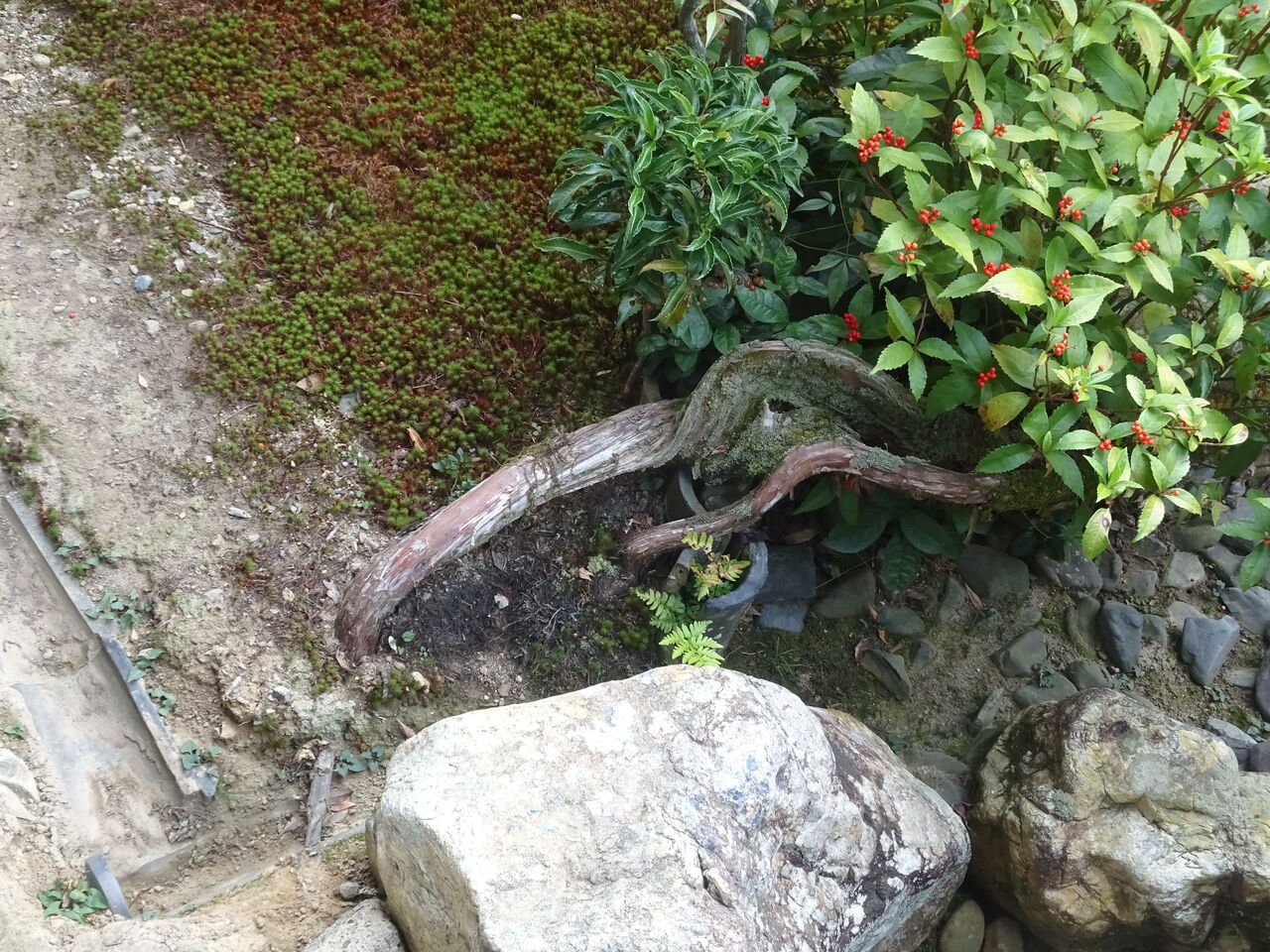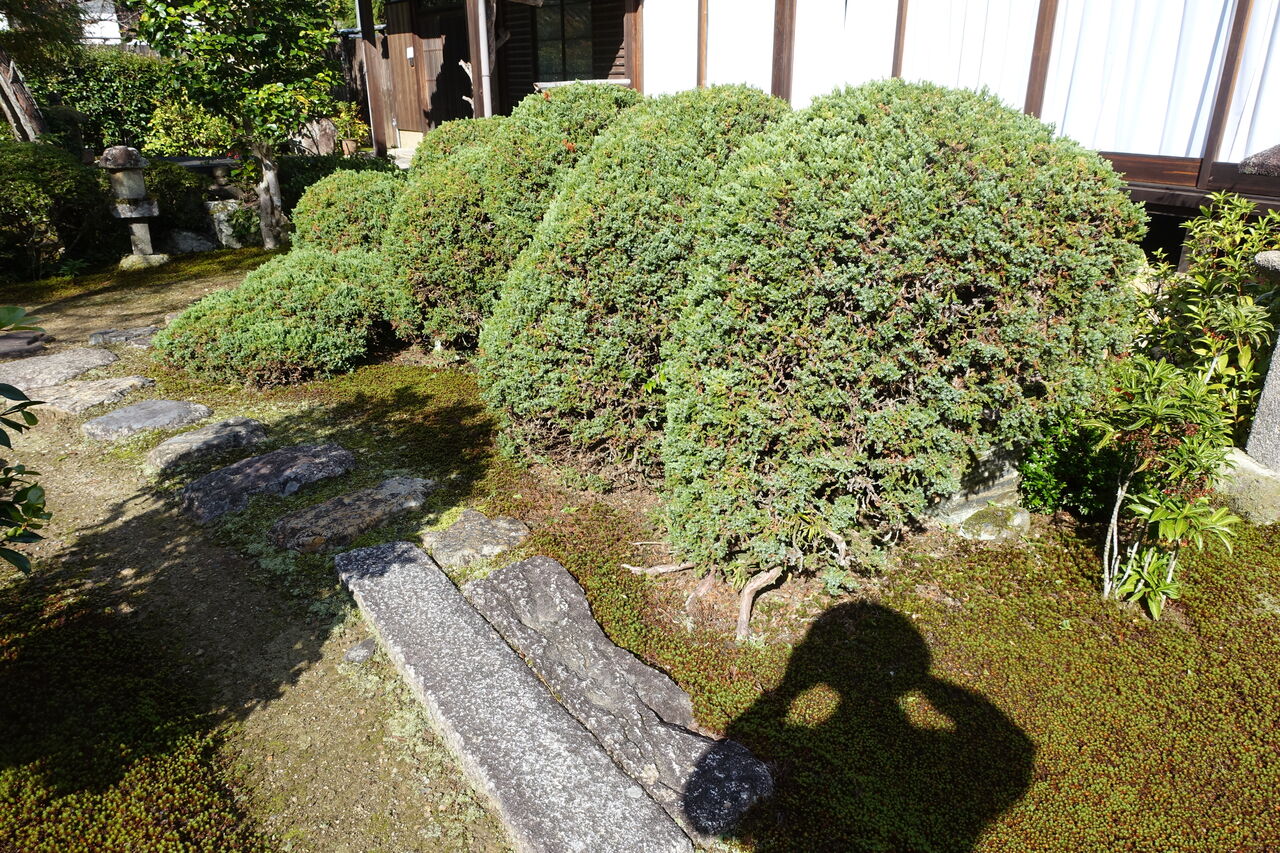 2023年11月09日 ハイビャクシン 面白い木じゃ?? モコモコ!!じゃ!! 和尚が植木刈りをして、モコモコ。 この木がハイビャクシンと言うらしい! このモコモコが一本の根っこ・ 幹から出てるって分るかのう?? 手前の根元に幹の元が有り!! 蛇の様ににょろにょろ地面を這って。 このモコモコに繋がっておる。 このビャクシンを気長に和尚が剪定しとる!! 本真に気の長い和尚じゃ!!! 一度数えたが2000本越える枝を切っておった。 花切狭で、枝を摘まんでは “ チョキン ” と。 二日半も掛かってこのモコモコを!! 御苦労はん!!ご苦労はん!!