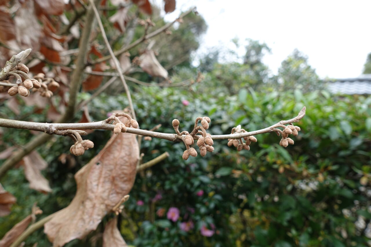2024年01月10日 春の用意 まだ枯れた葉っぱが付いとる! 確かに冬ではあるが? 本来、11月か遅くとも12月末には温暖化と言えども! 落ち葉で落ちて、木には葉っぱが無いのが普通じゃが!! しかし、枯れた葉っぱが有るのに、花の蕾が大きくなっておる!! 正月と言うのに、春の用意じゃ!! 今年は新年から暖かいから、花も早く咲くであろう。 万作の花は地味すぎるが、花は鼻じゃ!!!!!