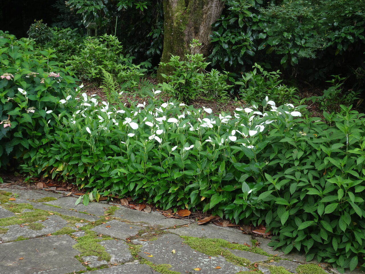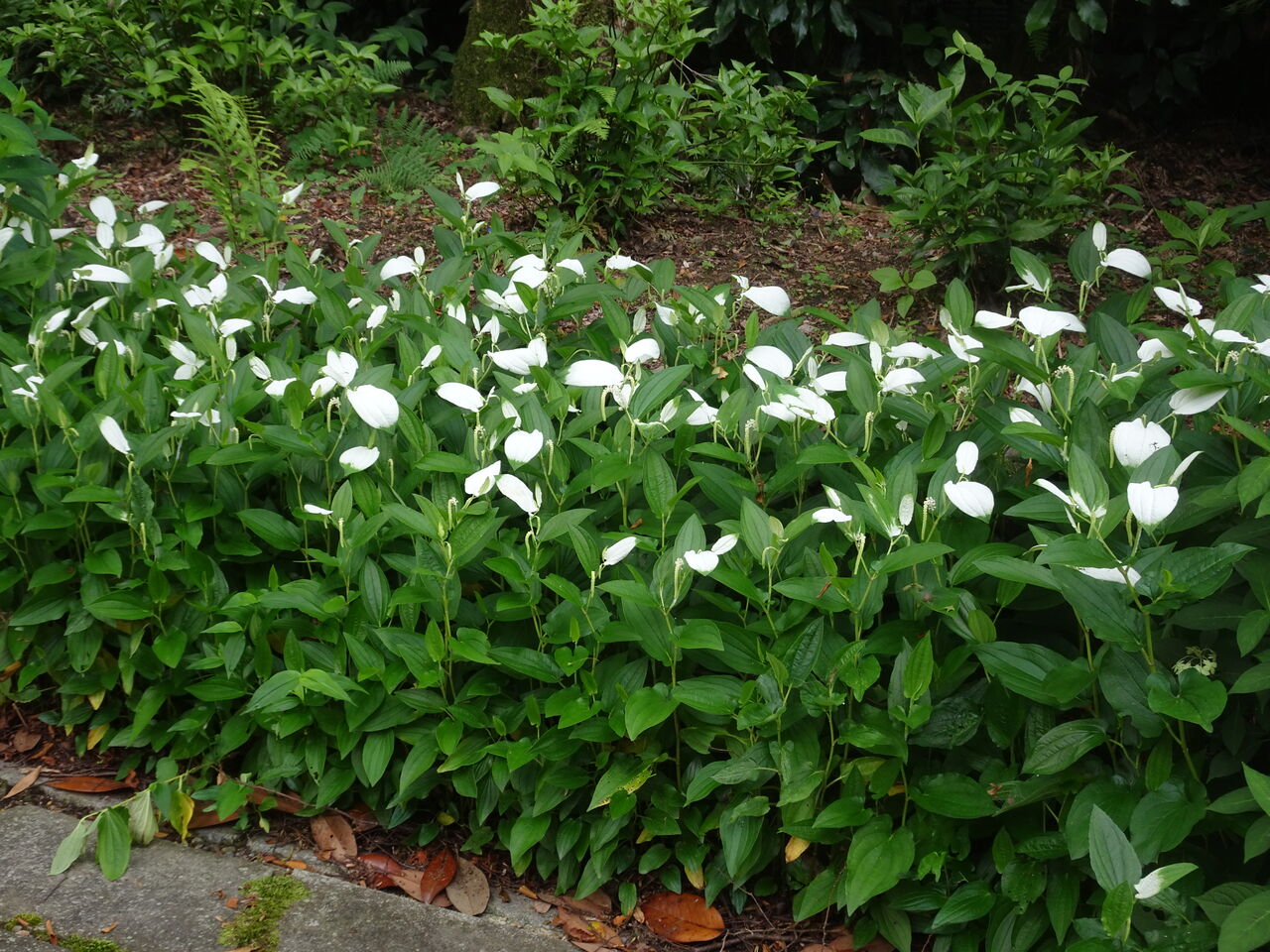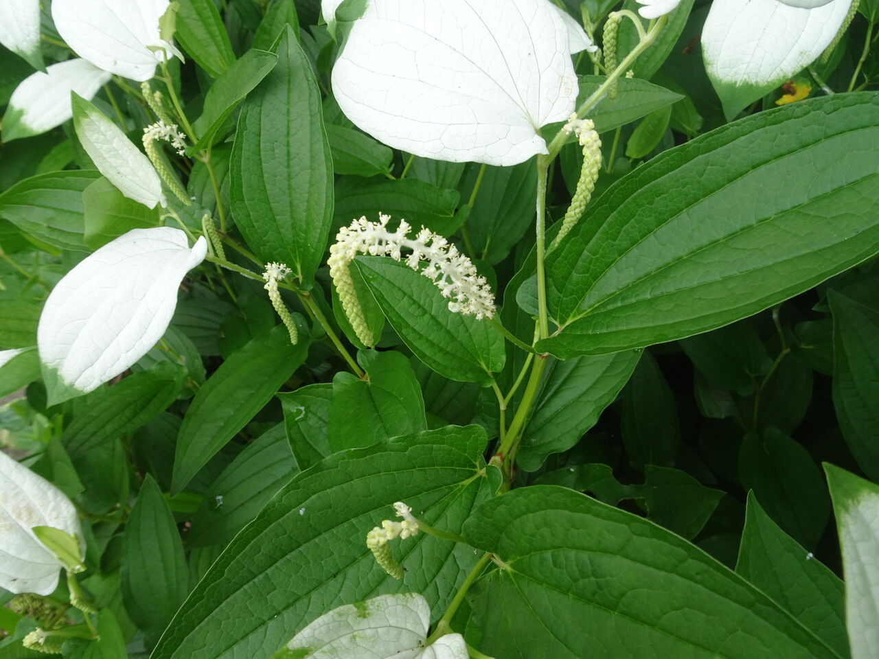2024年07月17日 半夏生 化粧をした! 本真に1~3枚が白くおしろいを塗った!! 花も咲いた! 化粧をしたのは葉っぱだけじゃ!! 花はその横じゃ! 何と、地味じゃ!! じゃが一面になるとええもんじゃ!!