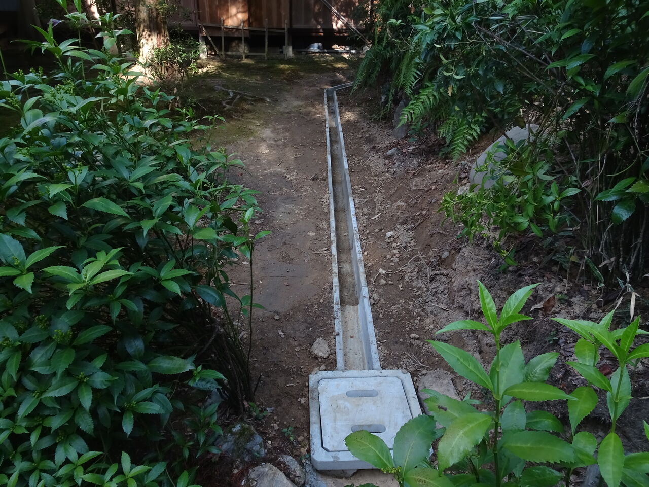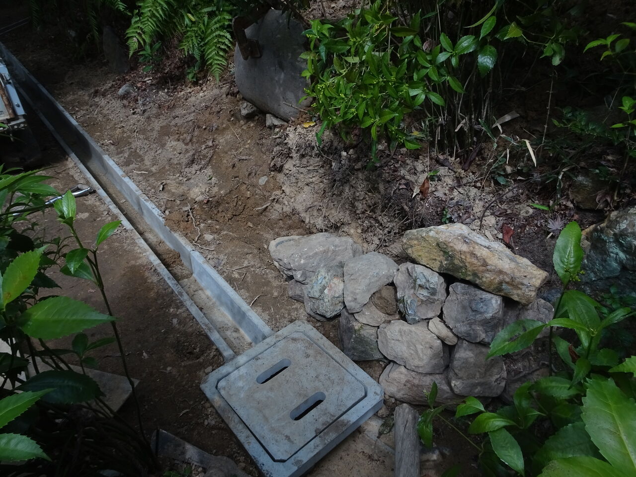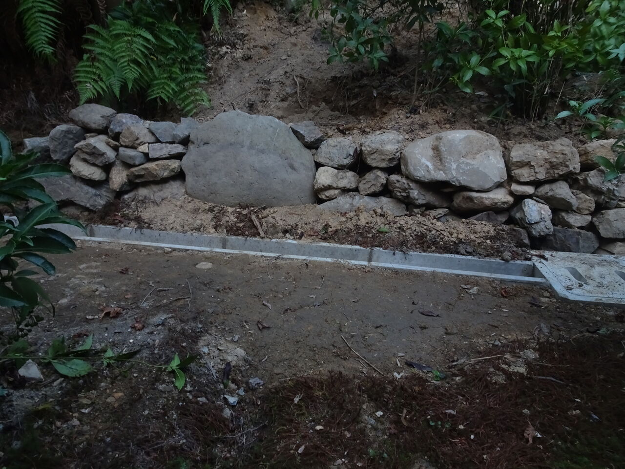 2024年10月13日 U字溝と石積み 離れの裏の工事!! U字溝と低い石積みが終わったようじゃ!! 崖の上からの雨水の流れを池に!! 建物の方に入り込まない様に!! 最近の大雨はたまらんからのう!! 完成したら大した工事に見えんが!! 溝を堀り、整地をし、水平を測り!! U字溝を設置し、石を運び積んで並べる!! いやあ、御苦労さんとだけ言っておこう!! いや、本真にご苦労さん!!!!!