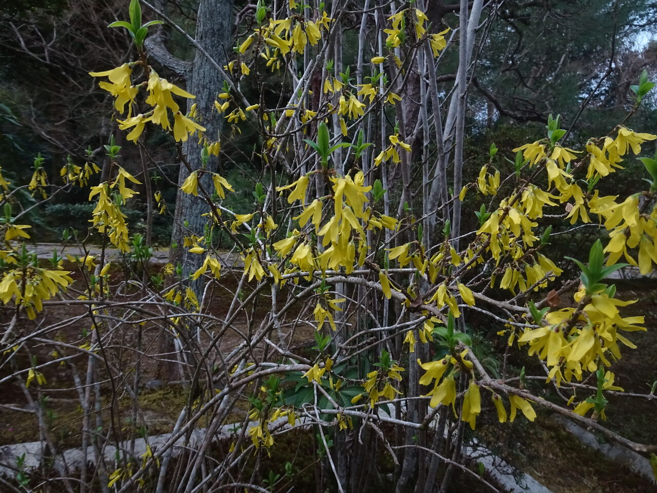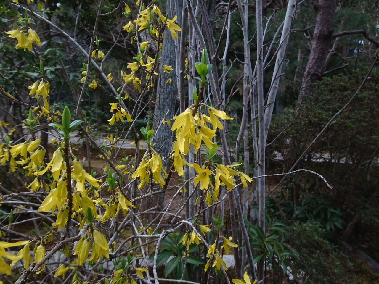 2025年04月09日 おう!忘れるとこじゃった! 中門の横に・・ 小さく剪定した黄色い花があった!! レンギョウじゃ!! 一個一個の花が咲いておるが!! 全体で結構自己主張しとる!! 和尚が小さくしているのが分かる!! 大きい木に咲くと圧迫感がありそうじゃ!!! それも面白いので、和尚に提案してみようか??? お目見えは数年後か?????