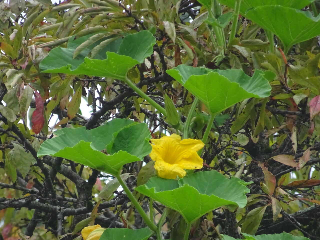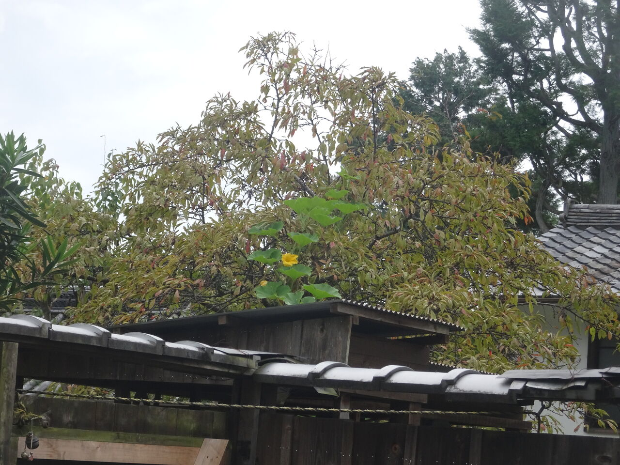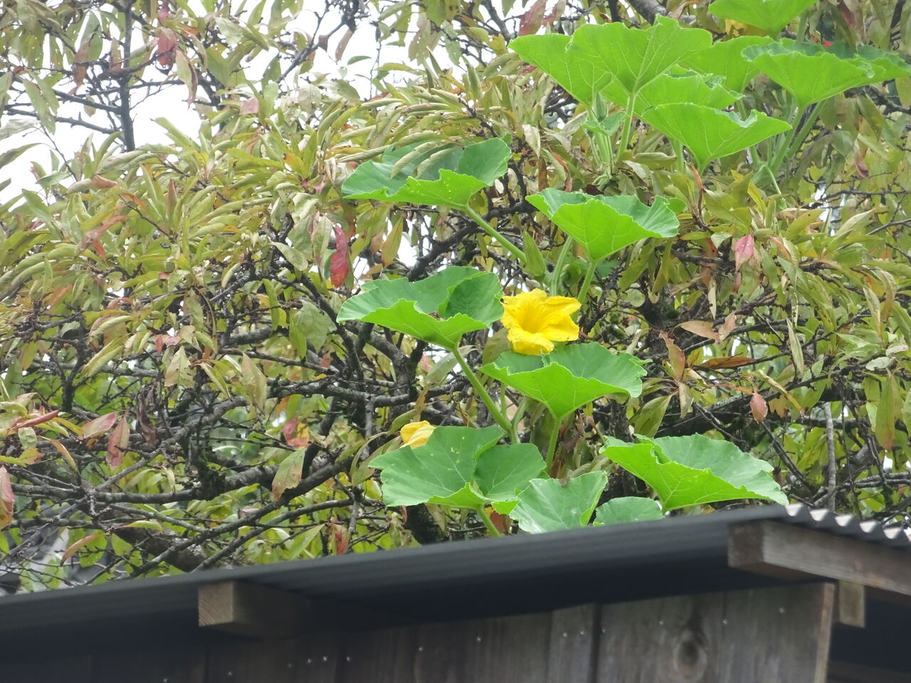 2025年10月24日 最後の最後の努力(カボチャ) 最後の頑張りをしているカボチャ・・ お日様を求め、木の上に・・ 最後の実を付けようとスモモの枝に巻き付き!! 物置越えに見えるぐらい登っている!! じゃが・・・ 日照不足で花は付けども・・・・・ 結実はせず!!!!! 可愛そうに!!!!!